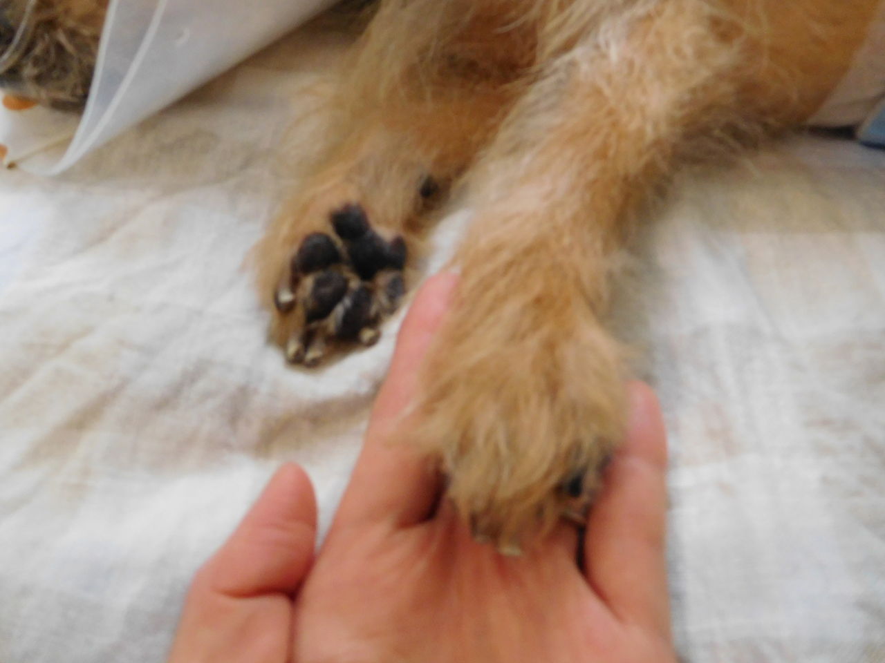 亡くなる10日ほど前、とんがりコーン臭のする愛犬の肉球。あまりにかわいいので握手(親ばかです)。このころ、ほとんどの時間横になっていましたが、トイレには立ち上がっていくことができました。