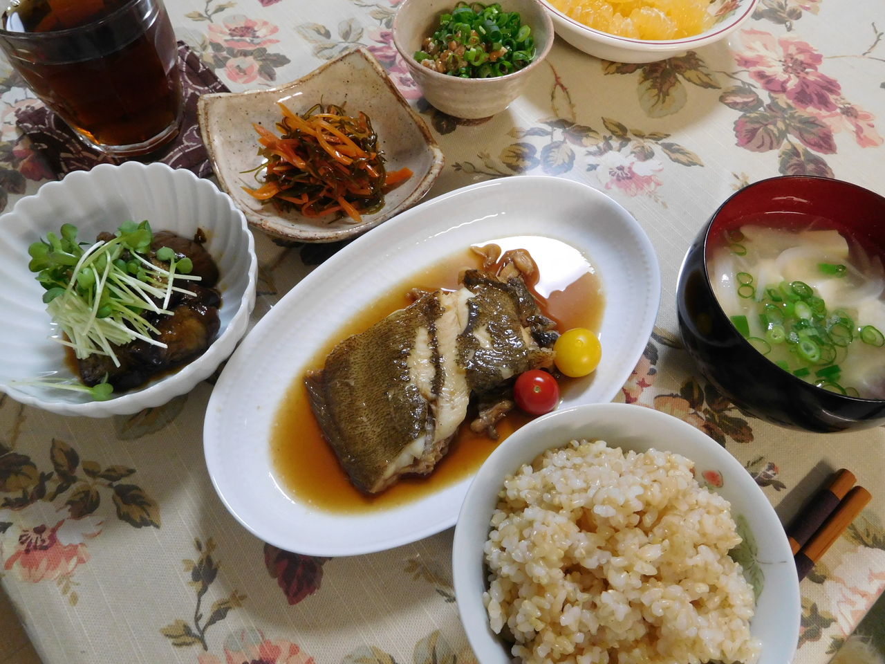 〇玄米ご飯〇豆腐と玉ねぎのお味噌汁〇ヒラメの煮つけ〇なすの揚げ煮〇人参とすき昆布の煮物〇納豆〇サンフルーツ