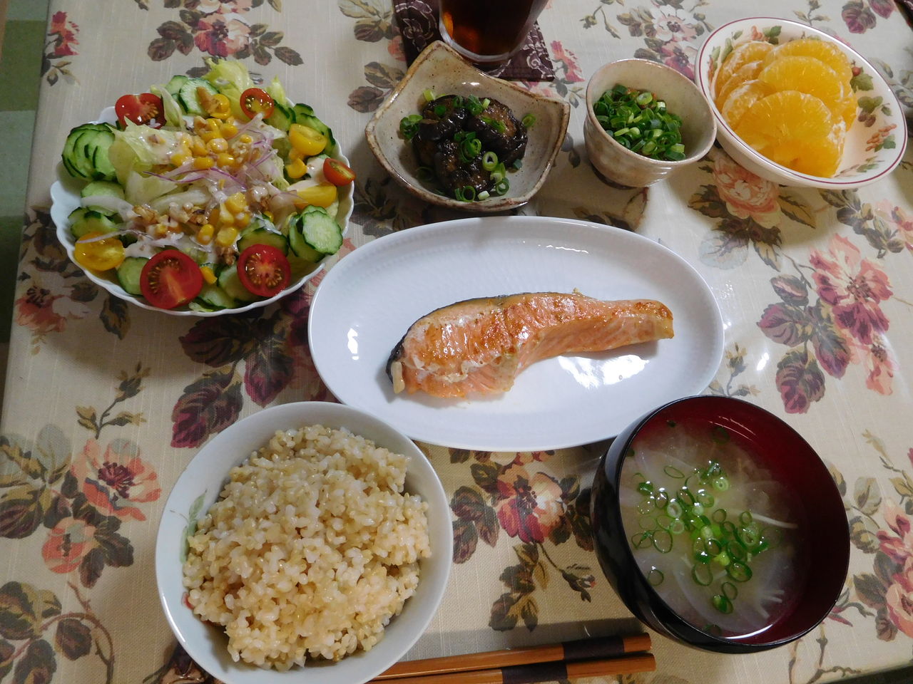 〇玄米ご飯〇えのきと玉ねぎのお味噌汁〇塩鮭〇サラダ〇なすの揚げ煮〇納豆〇サンフルーツ