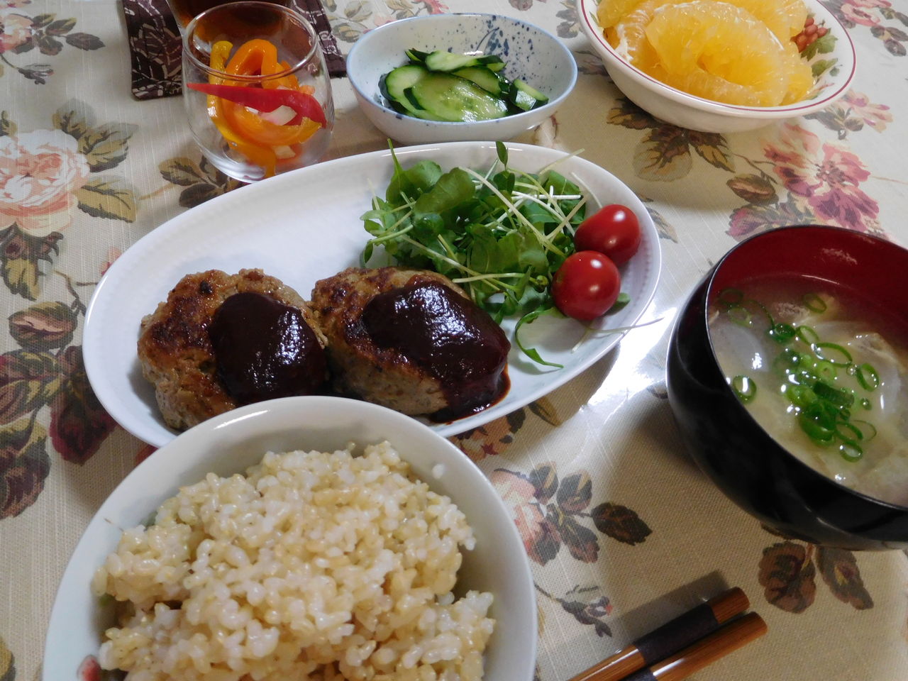 〇玄米ご飯〇玉ねぎと油揚げのお味噌汁〇ハンバーグ〇パプリカ、紫玉ねぎ、人参のピクルス〇キュウリの浅漬け〇河内晩柑