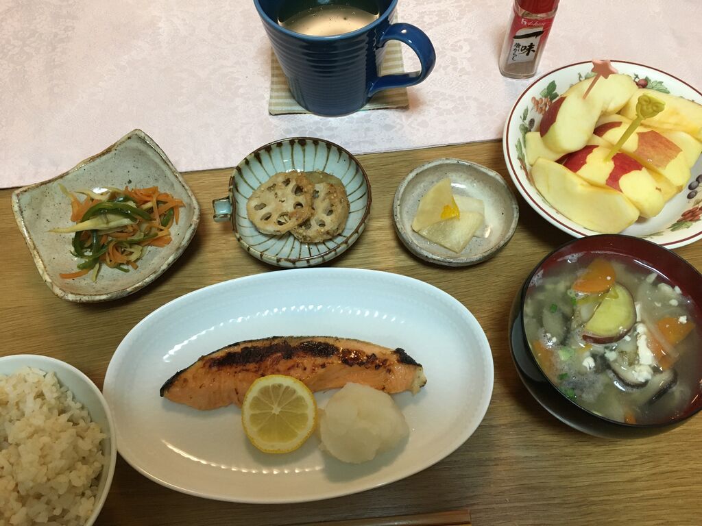◯五分つきご飯◯お味噌汁(玉ねぎ、人参、しいたけ、大根)◯鰆の西京焼き◯大根のゆず漬け◯人参、ピーマン、舞茸のきんぴら◯れんこんとさつまいもの甘辛ごまがらめ◯納豆◯りんご