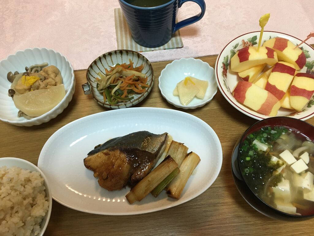 ◯五分つきご飯◯お味噌汁(豆腐、人参、玉ねぎ、しめじ、のり)◯ブリの照焼◯大根、がんも、しめじの煮物◯人参、ピーマン、舞茸のきんぴら◯大根のゆず漬け◯りんご