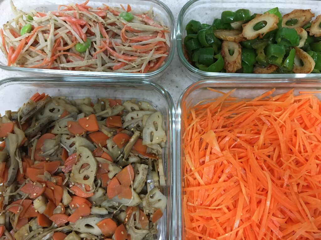 ◯五分つきご飯◯けんちん汁◯鮭の西京焼き◯にんじん、ピーマン、舞茸のきんぴら◯れんこんとさつまいもの甘辛ごまがらめ◯大根のゆず漬け◯りんご