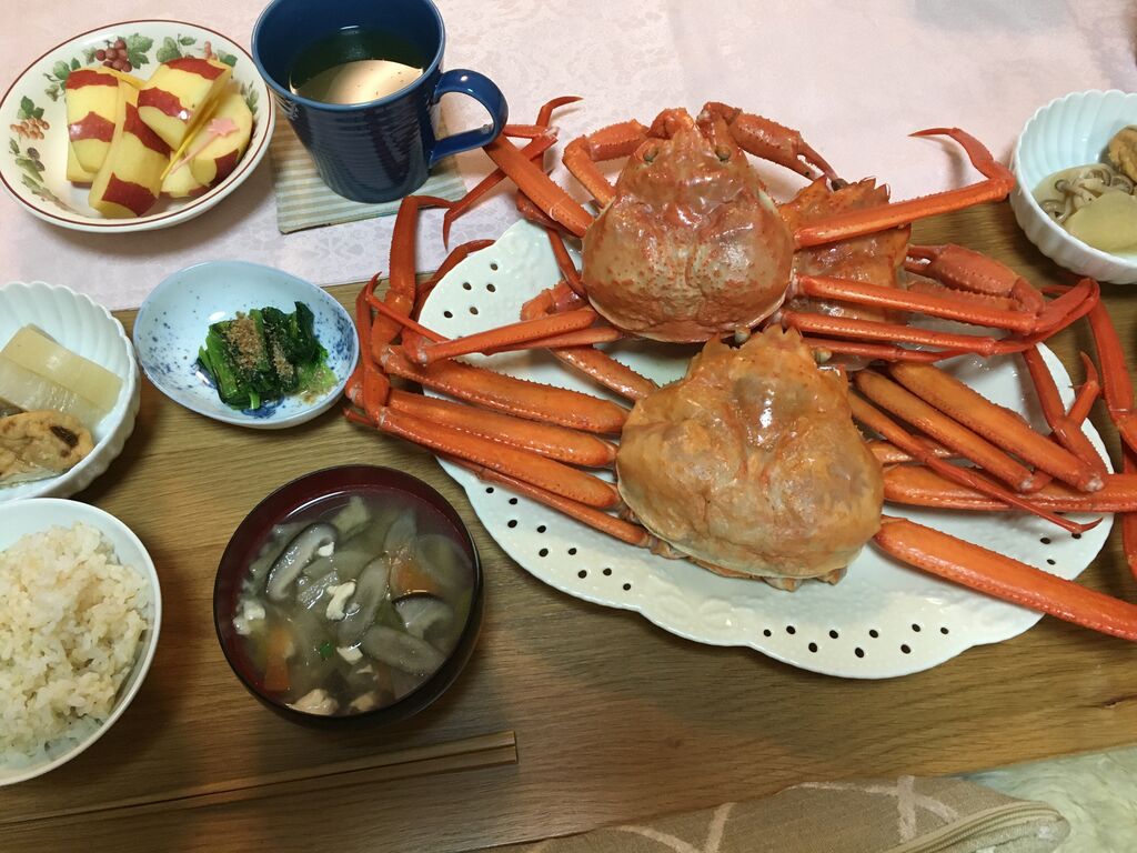 ◯五分つきご飯◯けんちん汁◯紅ズワイガニ(2人分)◯大根、がんもどき、しめじの煮物◯小松菜のおひたし◯りんご(2人分)