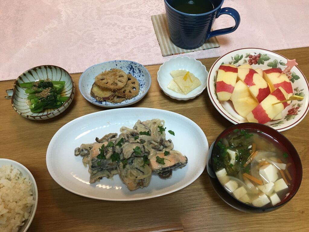 ◯五分つきご飯◯お味噌汁(豆腐、玉ねぎ、人参、しめじ、のり)◯鮭ときのこのクリームソース◯小松菜のおひたし◯れんこんとさつまいもの甘辛ごまがらめ◯大根のゆず漬け◯りんご
