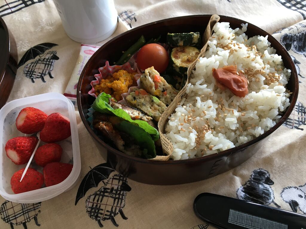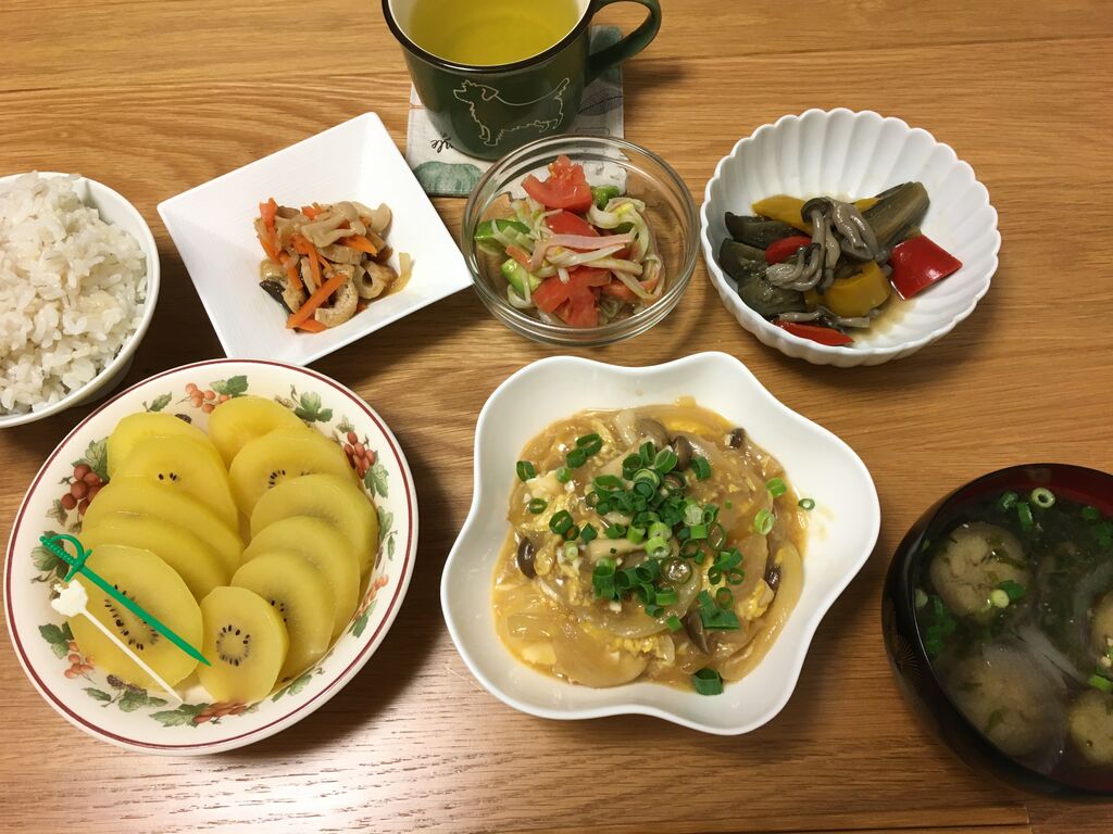 ◯もち麦ごはん◯お味噌汁(ナス、玉ねぎ、のり)◯甘辛豆腐の卵とじ◯切り干し大根の煮物◯アボカド、トマト、カニカマサラダ◯ナス、しめじ、パプリカの煮浸し◯キウイフルーツ