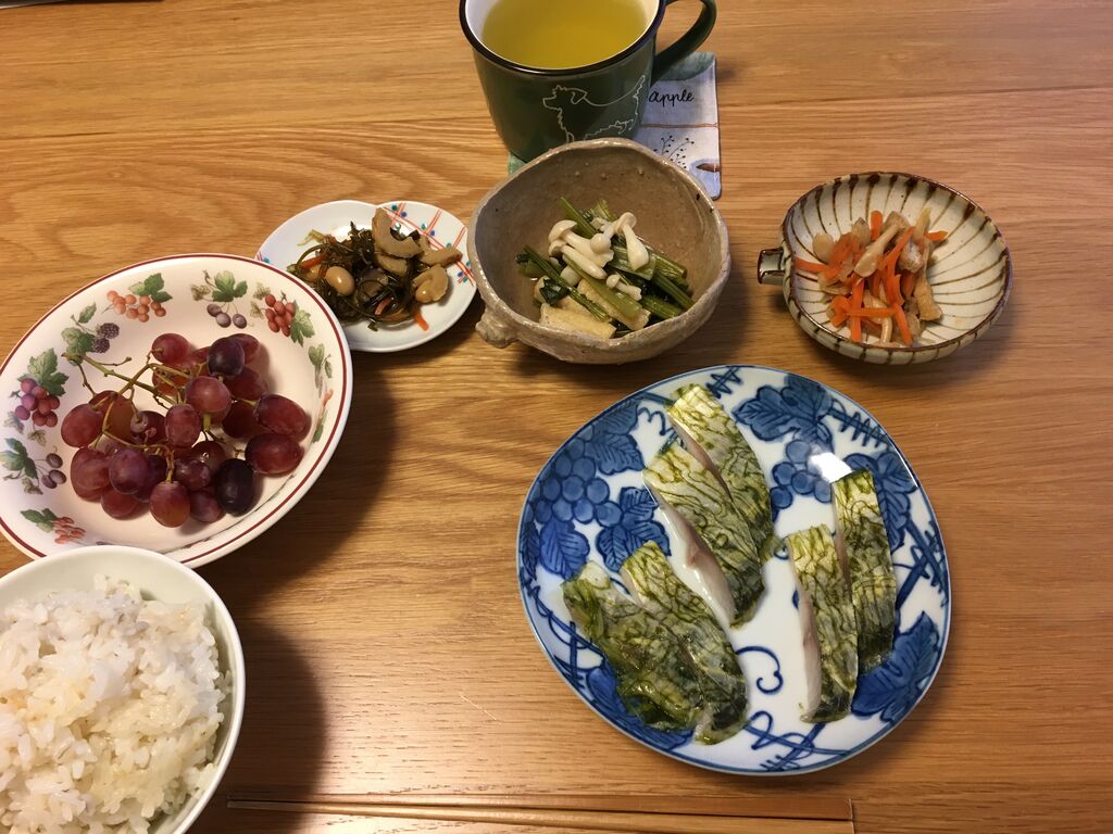 ◯もち麦ごはん◯しめ鯖◯切り昆布の煮物(市販品)◯小松菜と油揚げの煮浸し◯切り干し大根の煮物◯ぶどう