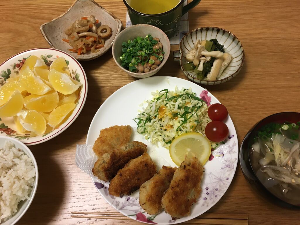 ◯もち麦ごはん◯お味噌汁(舞茸、キャベツ、玉ねぎ)◯イワシのフライ(冷食)◯切り干し大根の煮物◯納豆◯小松菜と油揚げの煮浸し◯ニューサマーオレンジ