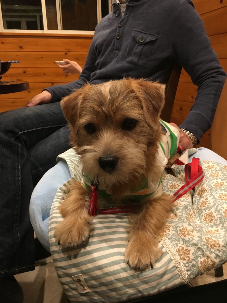 samも飼い主もお腹ペコペコ。待ちに待った夕食です。お席は、お友達家族と一緒にしていただき、楽しい夕食となりました。