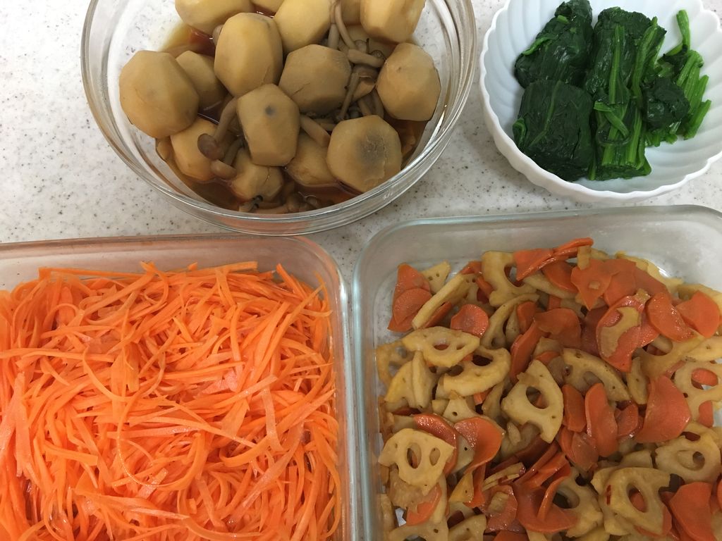 ◯里芋としめじの煮物◯茹でほうれん草◯キャロットラペ◯れんこんとにんじんのきんぴら