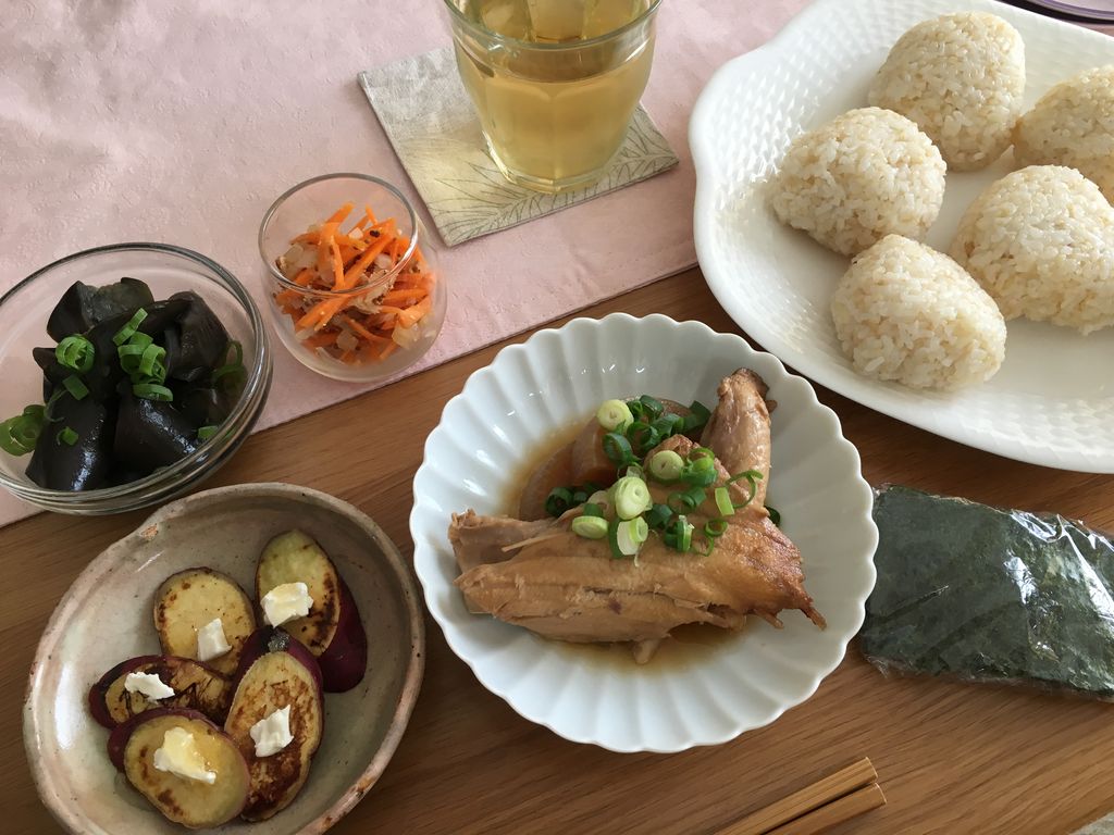 おにぎりと、残り物いろいろと、さつまいも(おにぎりは2人分です)