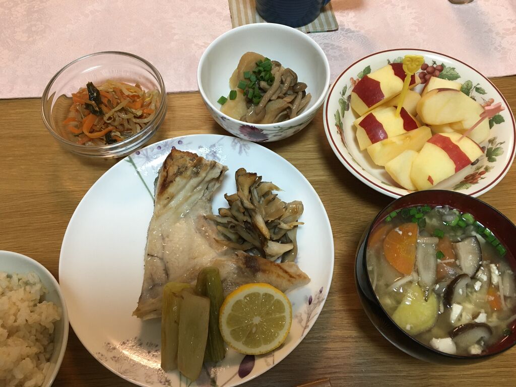 ◯五分つきご飯◯豚汁◯ぶりかまの塩焼き◯もやしのナムル風◯ホタテとじゃがいものバター醤油煮◯りんご