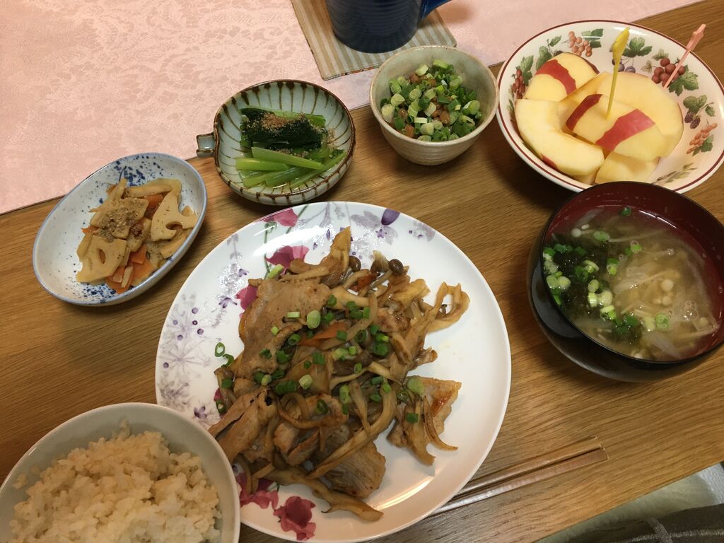 ◯五分つきご飯◯たまねぎ、えのき、のりのお味噌汁◯肉野菜炒め◯蓮根と人参のきんぴら◯小松菜のおひたし◯納豆◯りんご