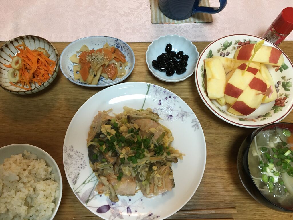 ◯五分つきご飯◯豚汁◯鮭と卵の甘酢あん◯人参とちくわの塩炒め◯蓮根と人参のきんぴら◯黒豆(市販品)◯りんご