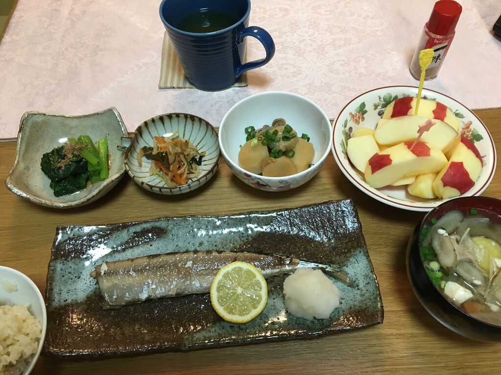 ◯五分つきご飯◯豚汁◯秋刀魚の塩焼き◯小松菜のおひたし◯もやしのナムル風◯じゃがいもとホタテのバター醤油煮◯りんご