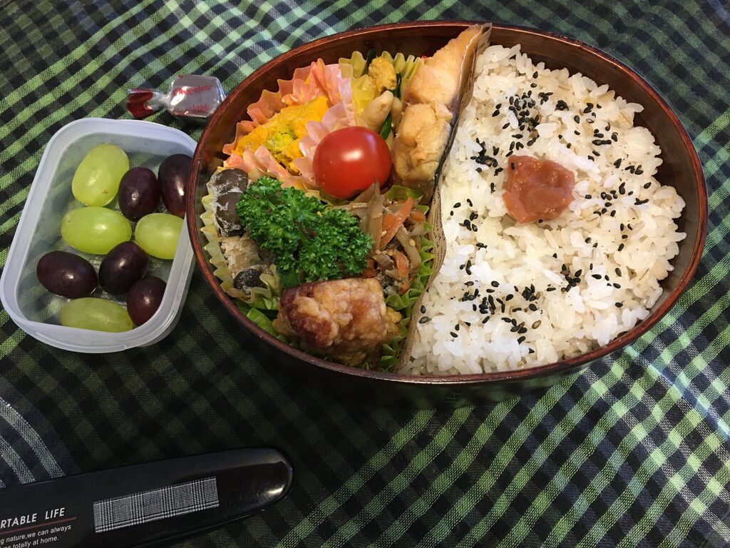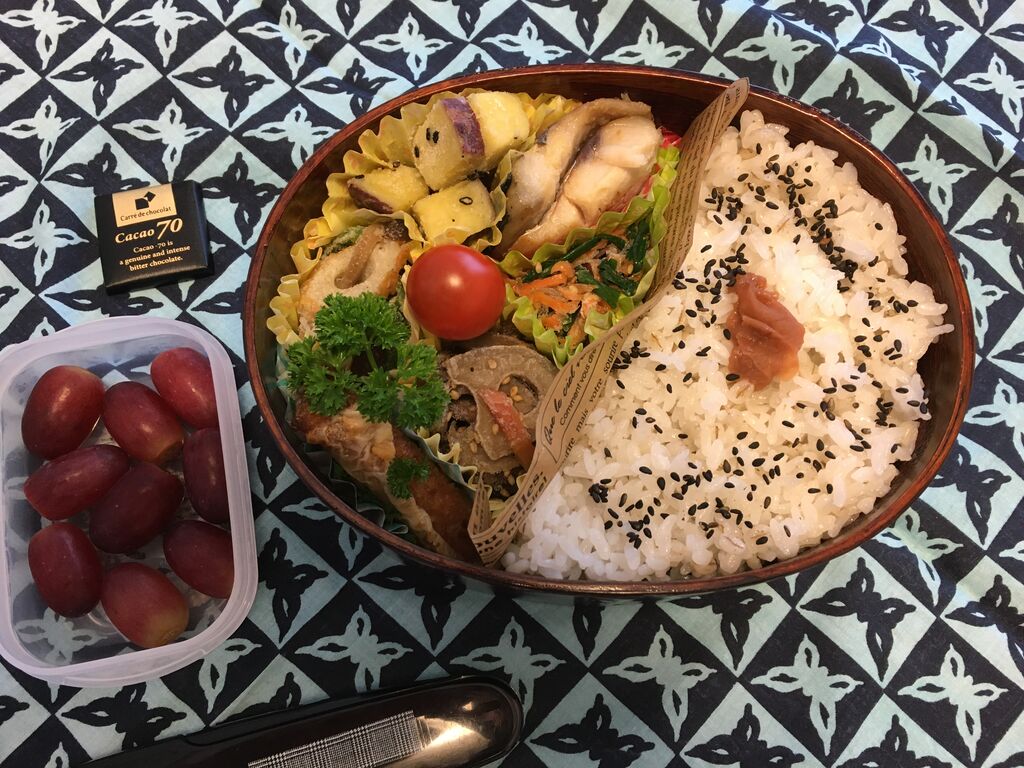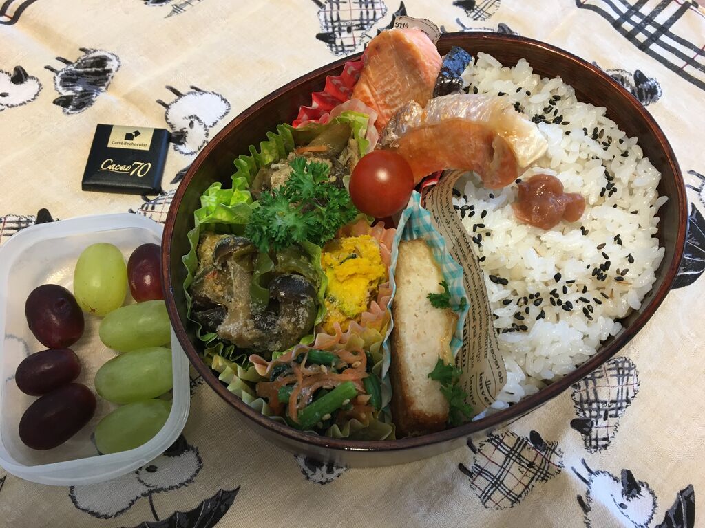 赤魚西京漬け、チキン南蛮(冷食)、かぼちゃの煮物、ピーマンとさつま揚げの炒め物、ごぼうの塩きんぴら、青梗菜ときのこのオイスターソース炒め、ぶどう