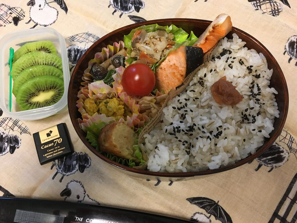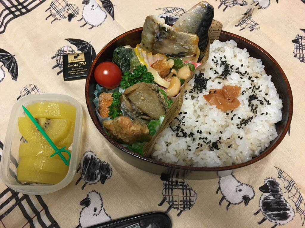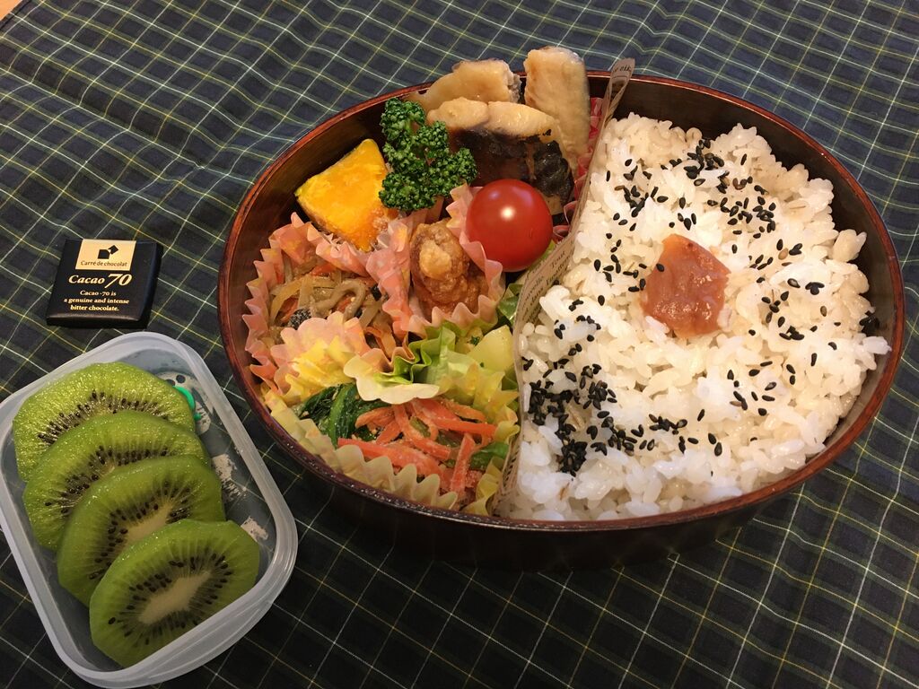 さばの西京漬け、フライドチキン(冷食)、さつまいものはちみつバター煮、人参とピーマンのきんぴら、茄子としめじの煮びたし、ごぼうの甘辛酢からめ、キウイフルーツ